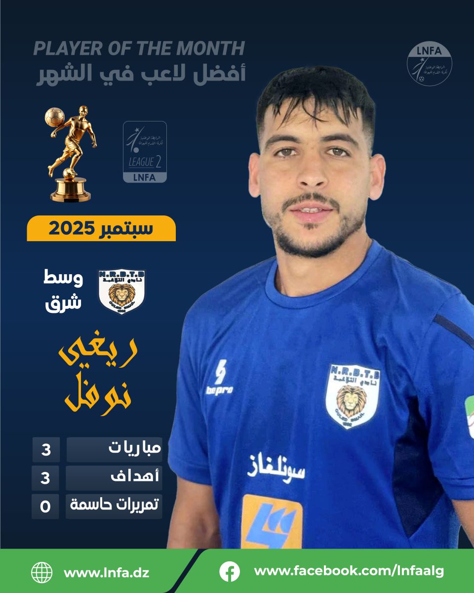 تعلن الرابطة الوطنية لكرة القدم للهواة عن نتائج التصويت الخاصة بجائزة أحسن لاعب لشهر سبتمبر 2025، والتي جاءت على النحو التالي: