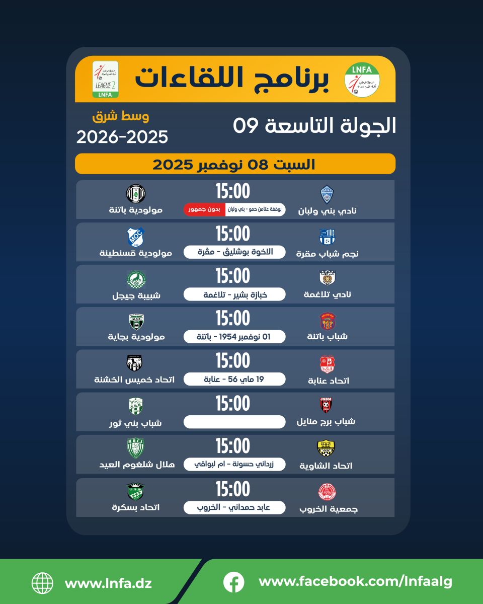 تعديل برنامج الجولة التاسعة يومي الجمعة 07 و السبت 08 نوفمبر 2025