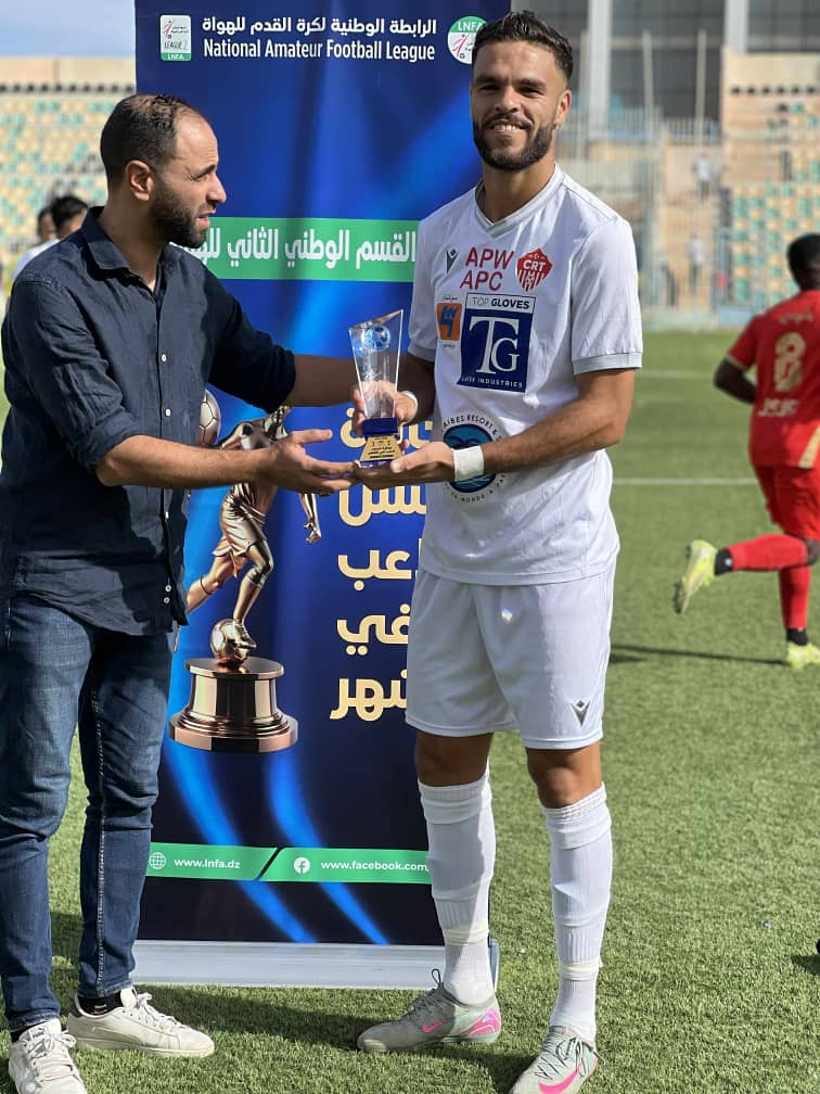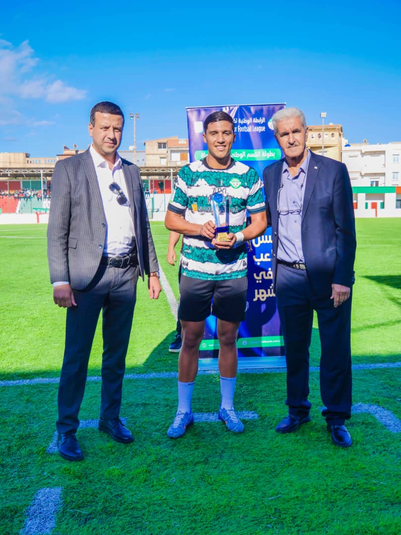 غنّام أحمد (شباب تيموشنت) تُوِّج بجائزة أفضل لاعب أكابر بعد عروض قوية ومستوى ثابت، وتسلم الجائزة من السيد رشيد مولاي، عضو المكتب التنفيذي للرابطة.