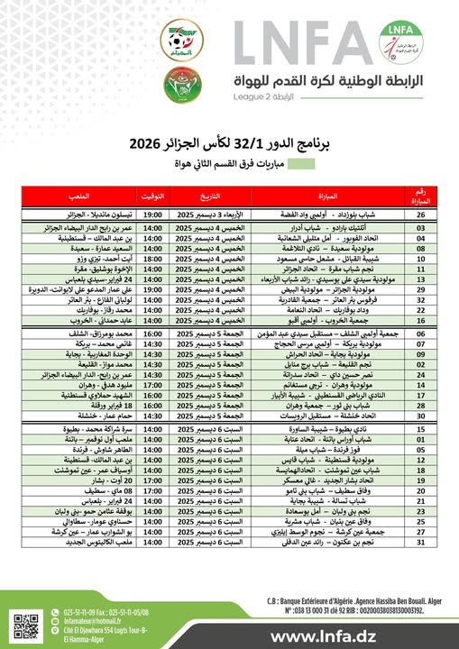 برنامج الدور 1/32 - كأس الجزائر 2026