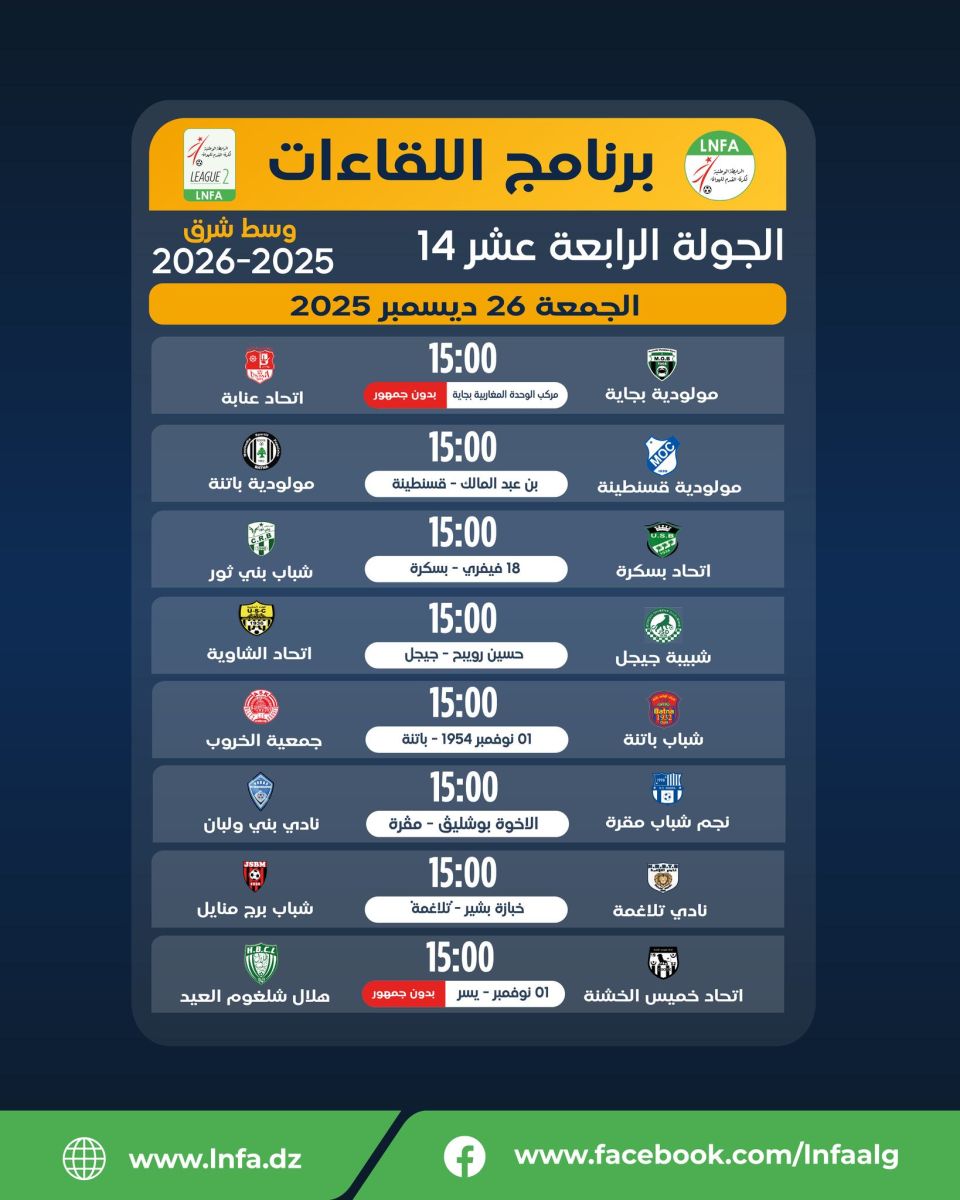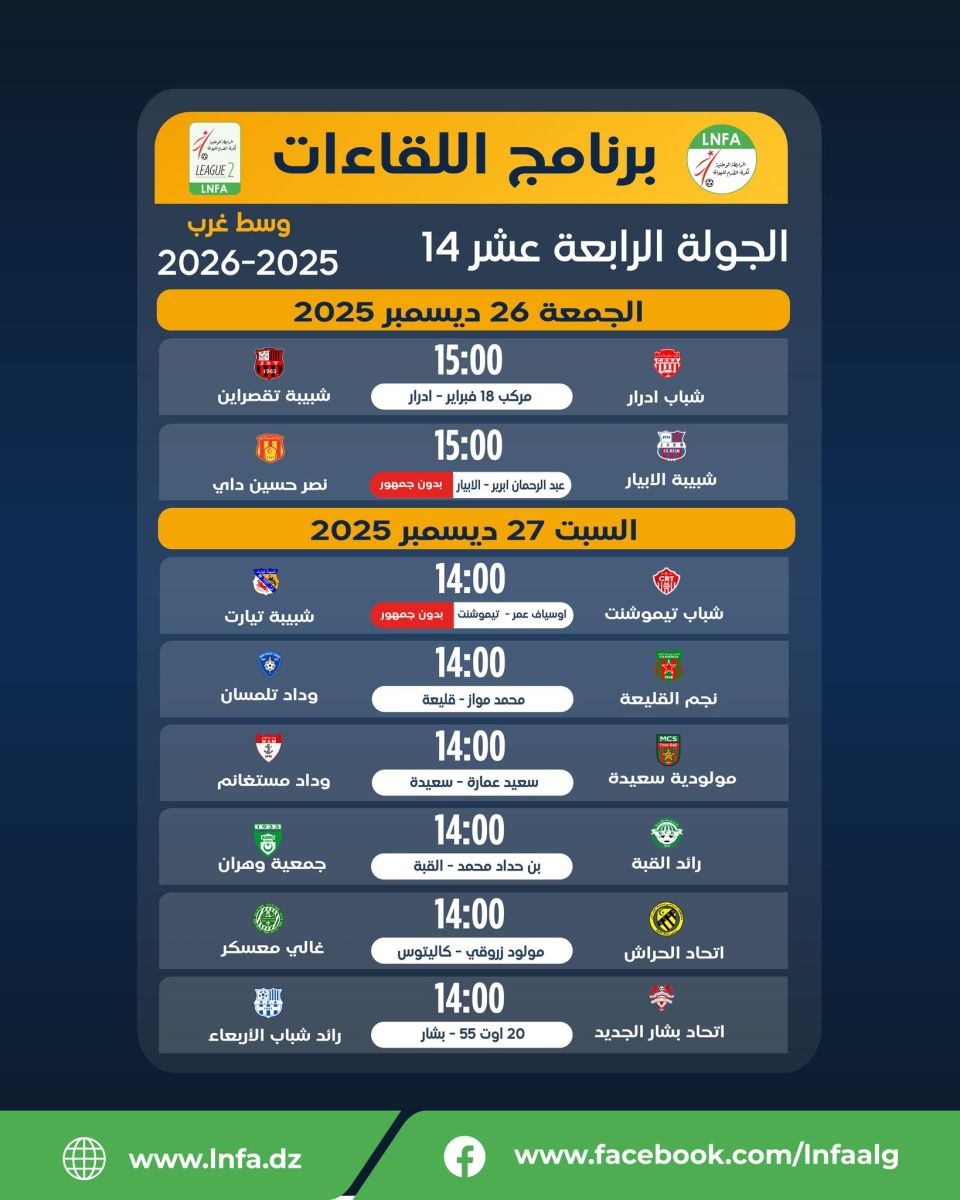 برنامج الجولة الرابعة عشر يوم الجمعة 26 و السبت 27 ديسمبر 2025