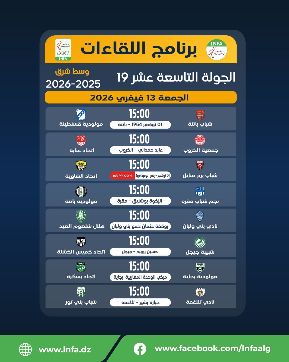 برنامج الجولة التاسعة عشر يوم الجمعة 13 فيفري 2026