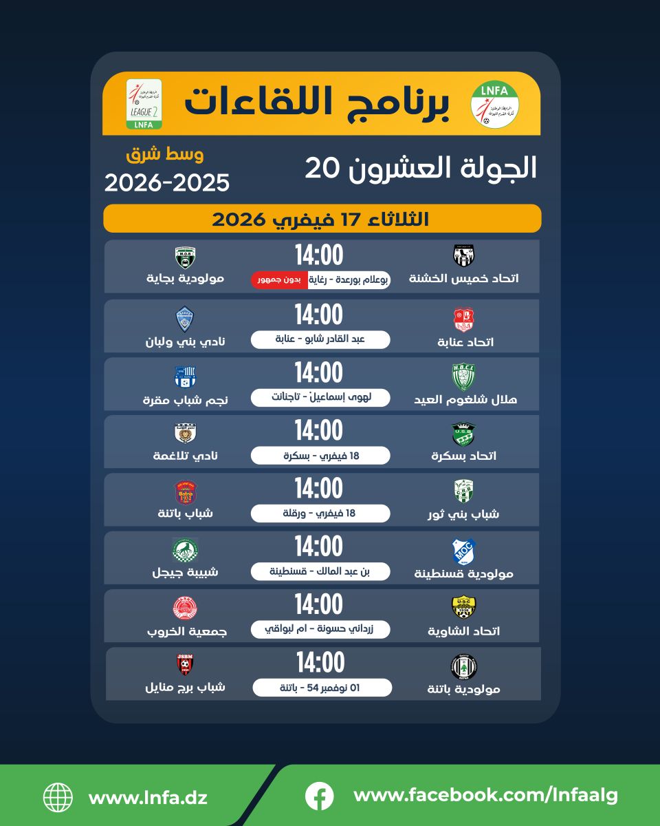 تعديل برنامج الجولة العشرون يوم الثلاثاء 17 فيفري 2026