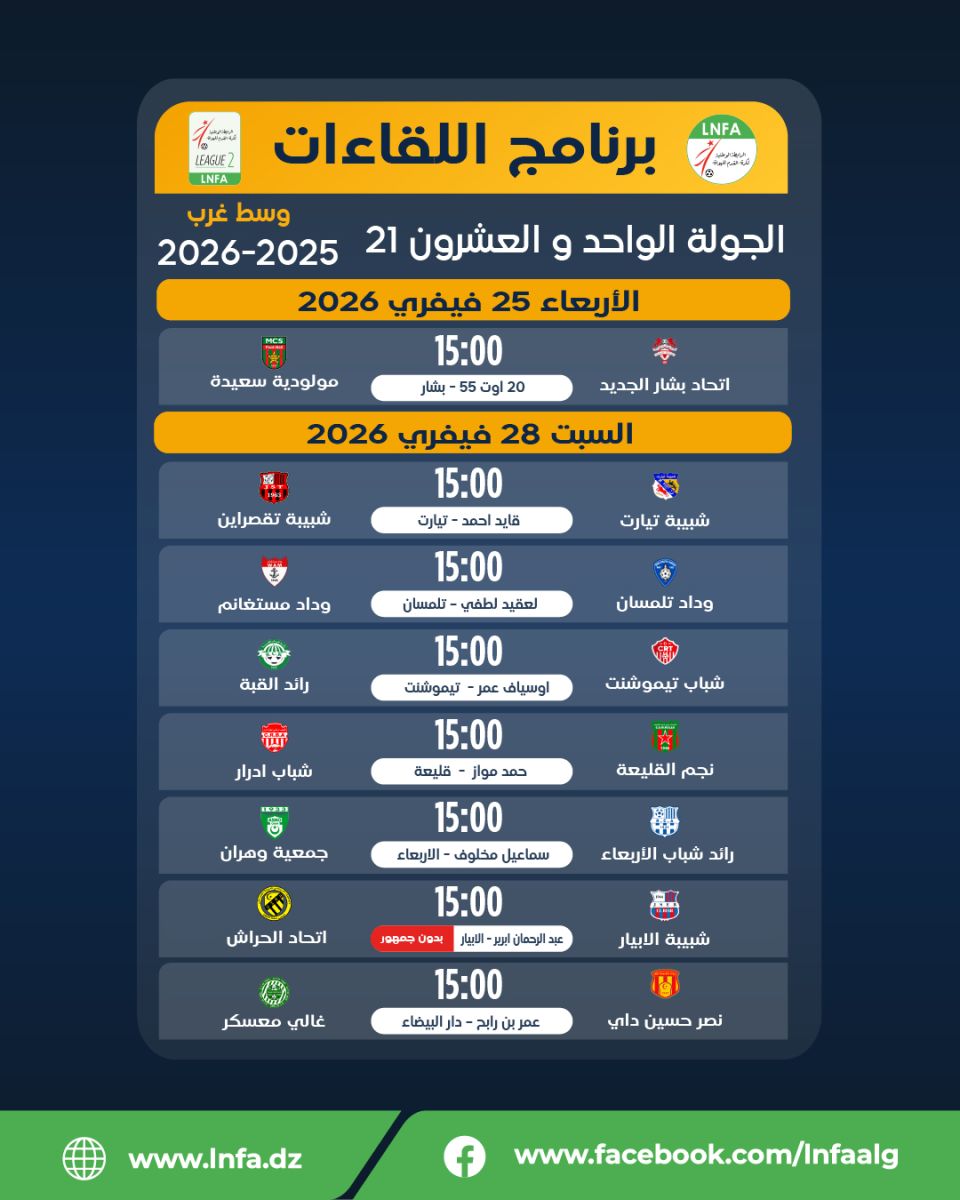 برنامج الجولة الواحد و العشرون ايام الاربعاء 25، الجمعة 27 و السبت 28 فيفري 2026