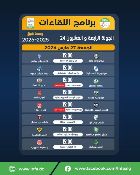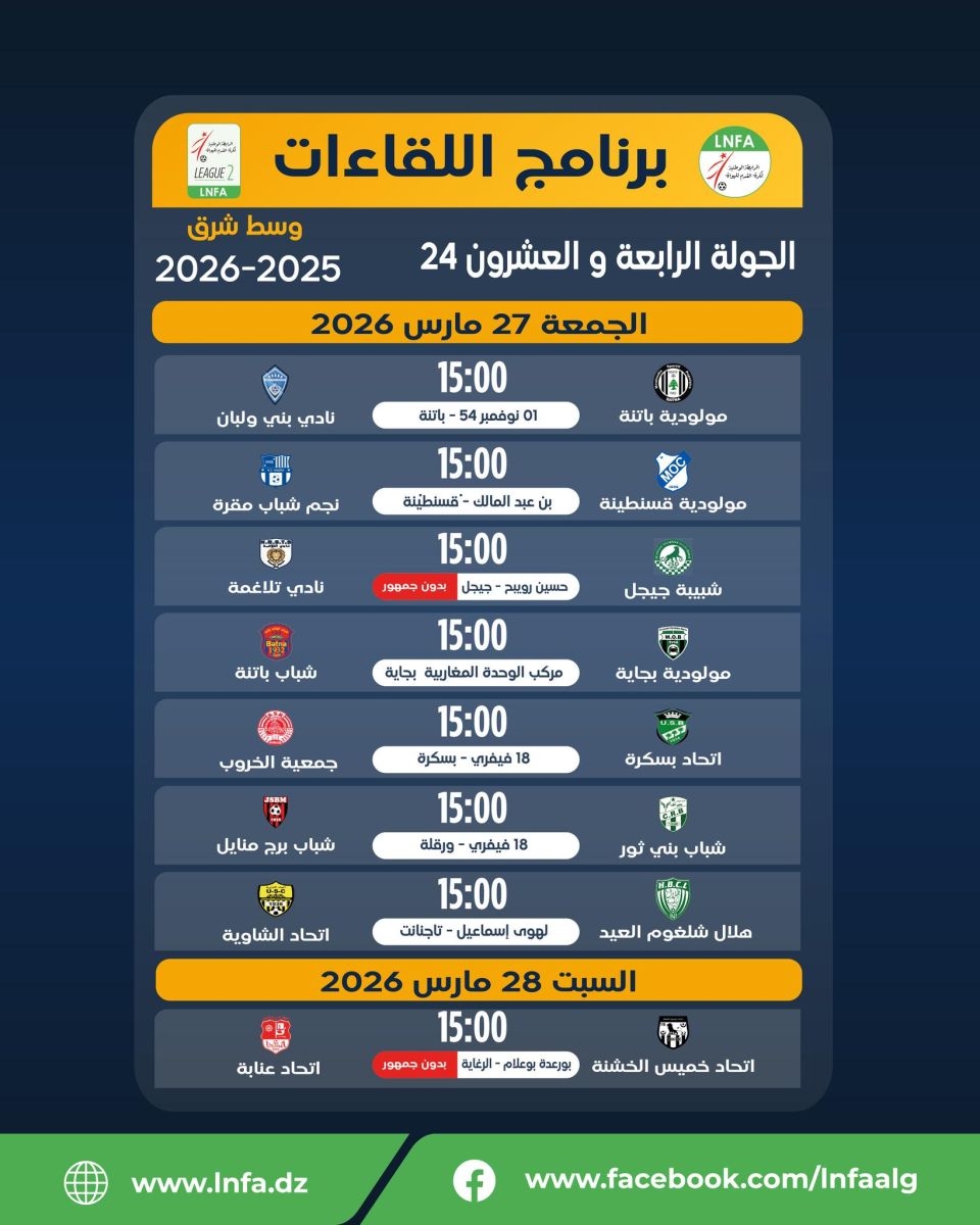 برنامج الجولة الرابعة و العشرون يومى الجمعة 27 و السبت 28 مارس 2026