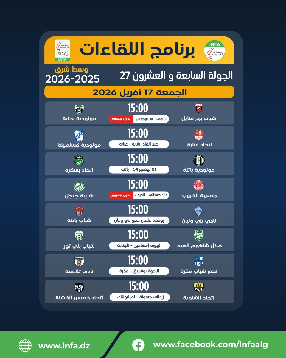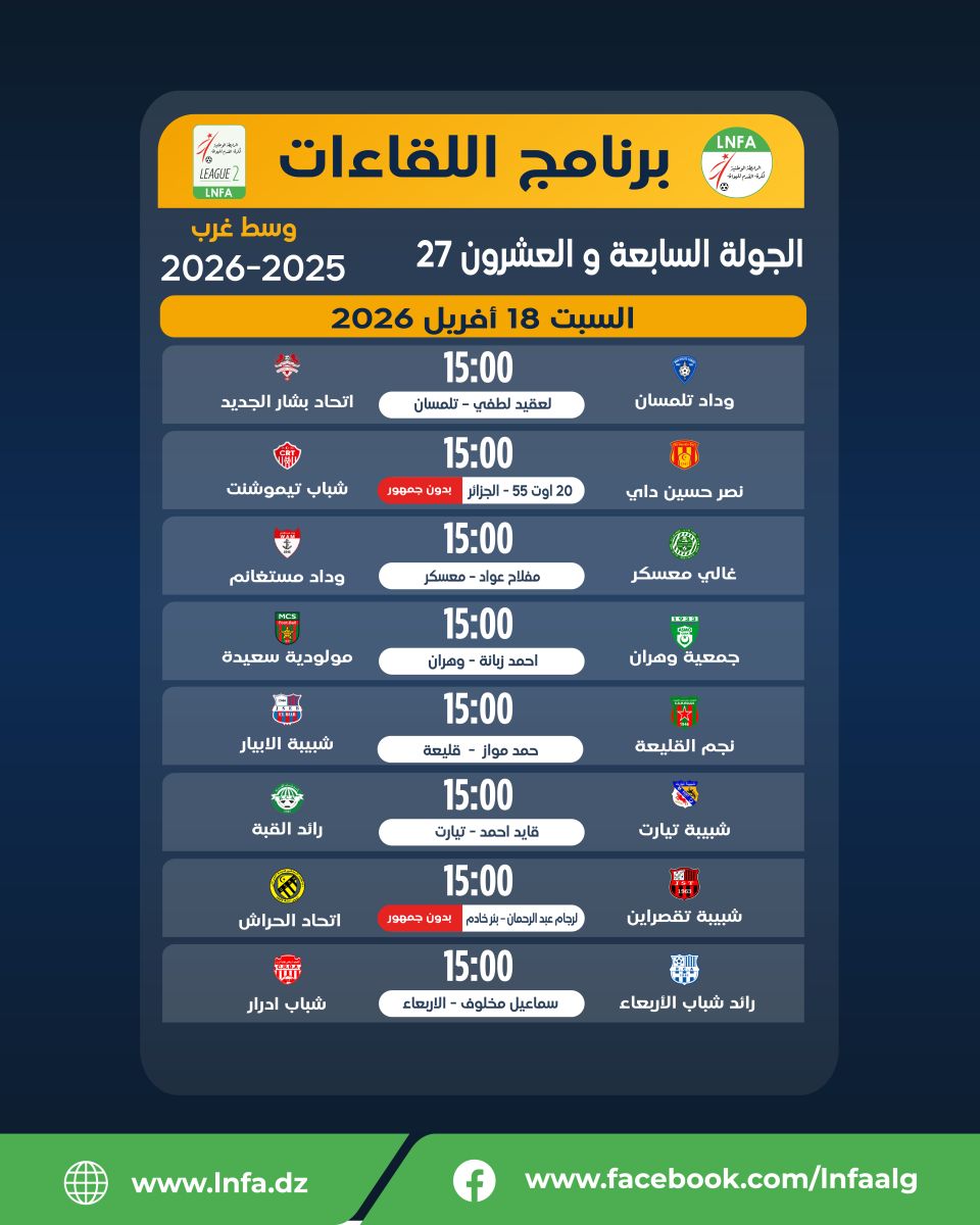 برنامج الجولة السابعة و العشرون يومى الجمعة 17 و السبت 18 افريل 2026