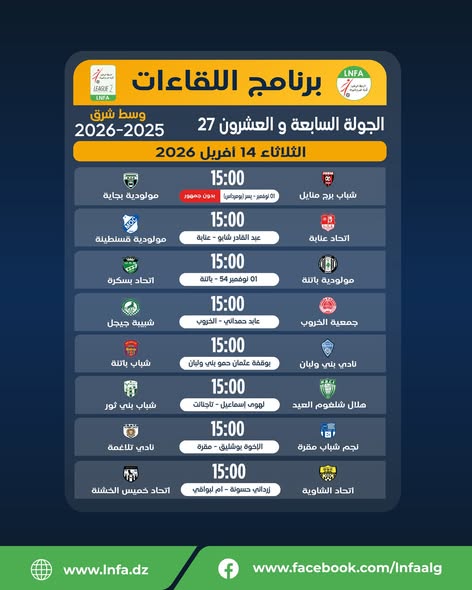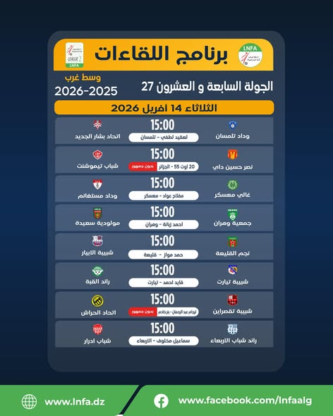 برنامج الجولة السابعة و العشرون يوم الثلاثاء 14 افريل 2026
