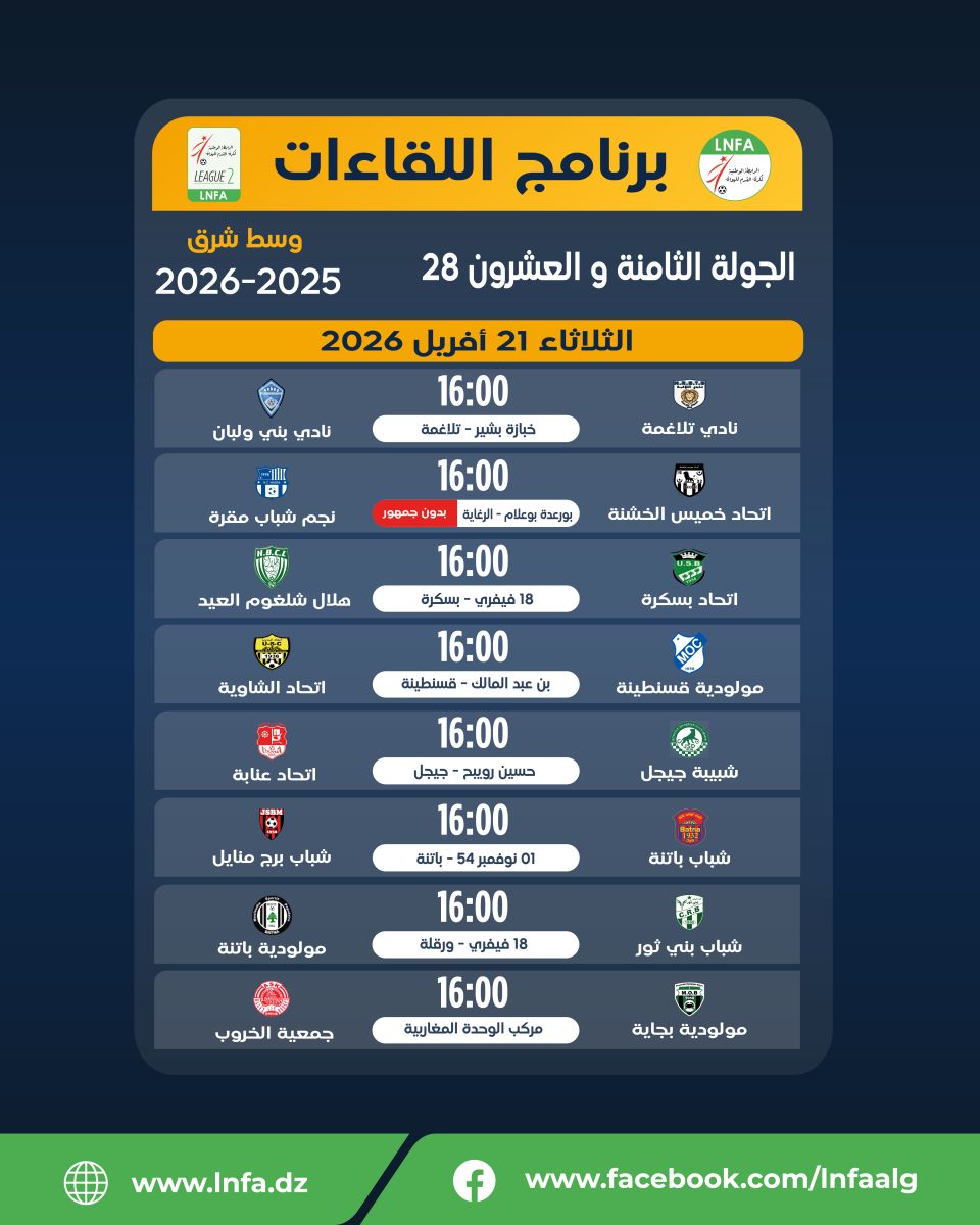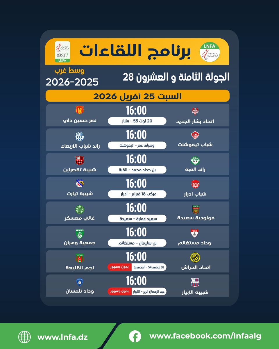 برنامج الجولة الثامنة و العشرون يومى الثلاثاء 21 و السبت 25 افريل 2026