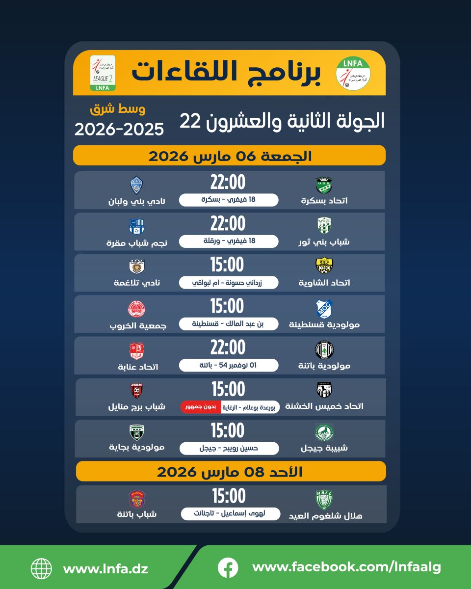 تعديل برنامج الجولة الثانية و العشرون ايام الجمعة 06 ، السبت 07 و الاثنين 09 مارس 2026