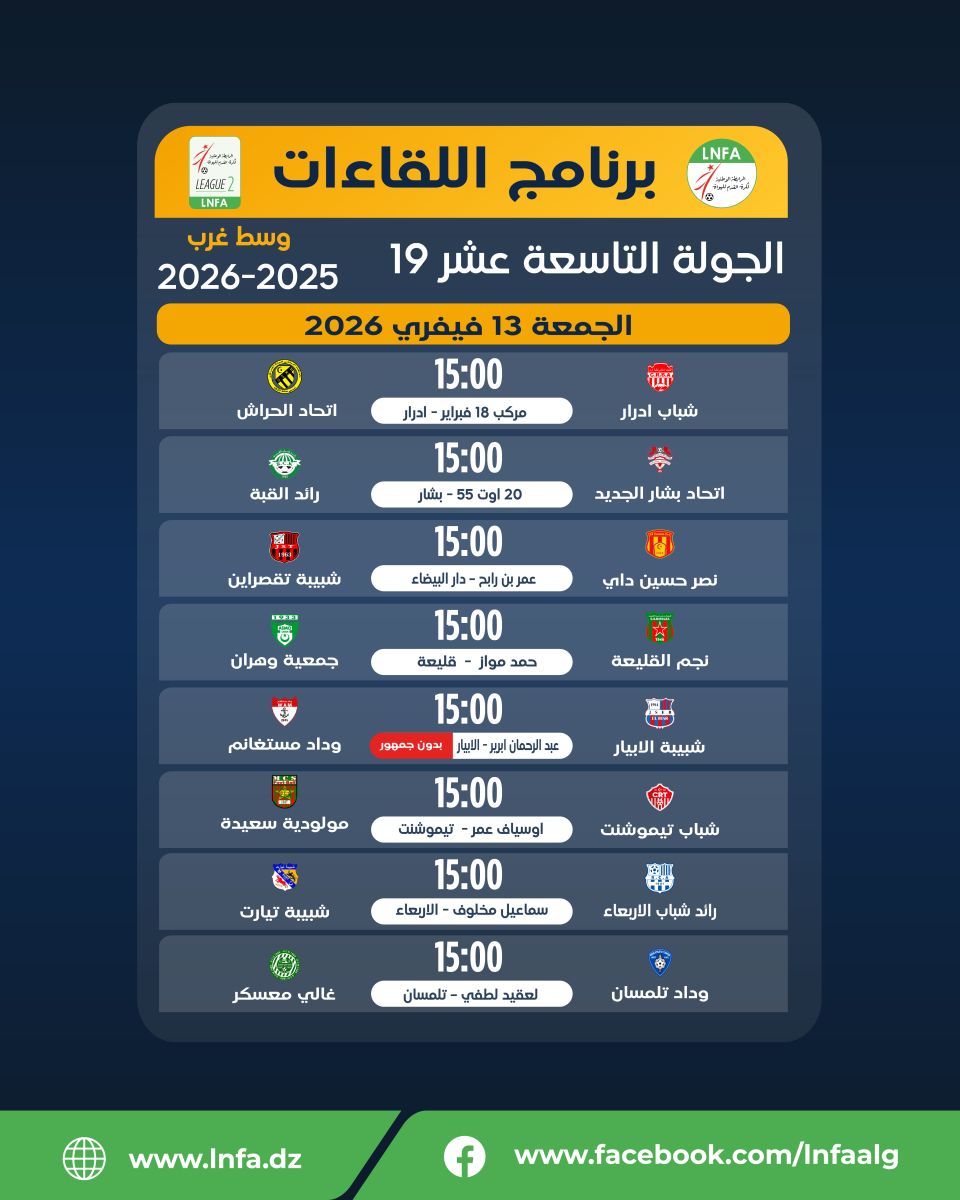 برنامج الجولة التاسعة عشر يوم الجمعة 13 فيفري 2026