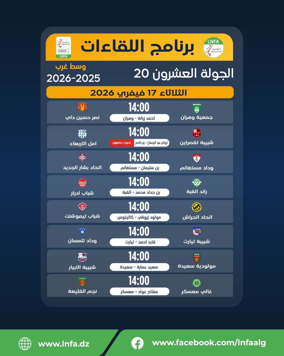 برنامج الجولة العشرون يوم الثلاثاء 17 فيفري 2026