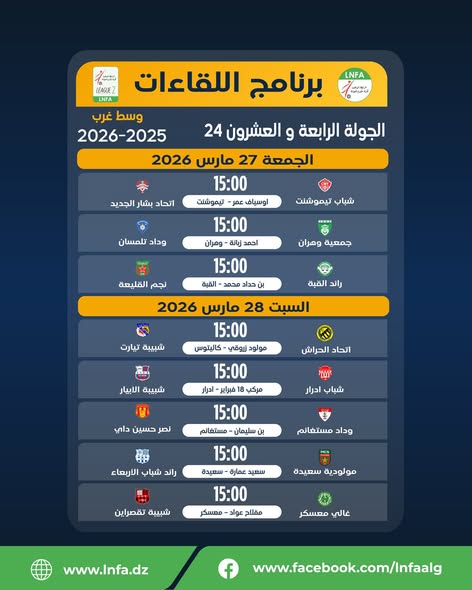 برنامج الجولة الرابعة و العشرون يومى الجمعة 27 و السبت 28 مارس 2026