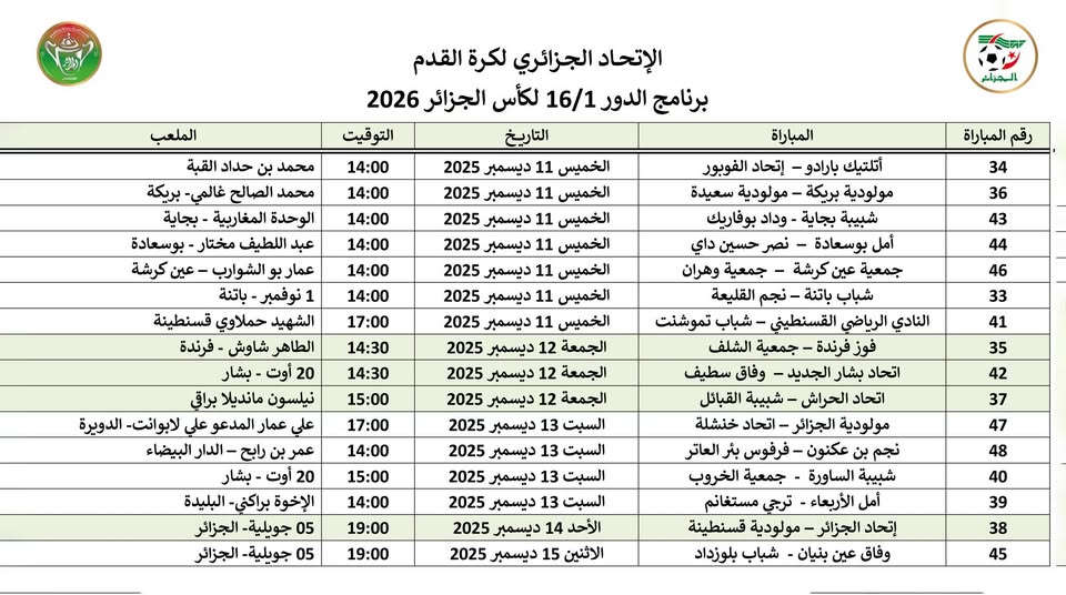 برنامج الدور 1/16 - كأس الجزائر 2026